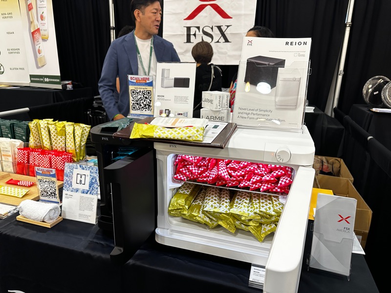 飲食店におしぼりを提供するFXS社は人気製品「REION」を紹介、香り付きのおしぼりや、食品業界だけでなく美容業界でも注目を集めている手ぬぐいサイズのおしぼりも紹介されていた。
