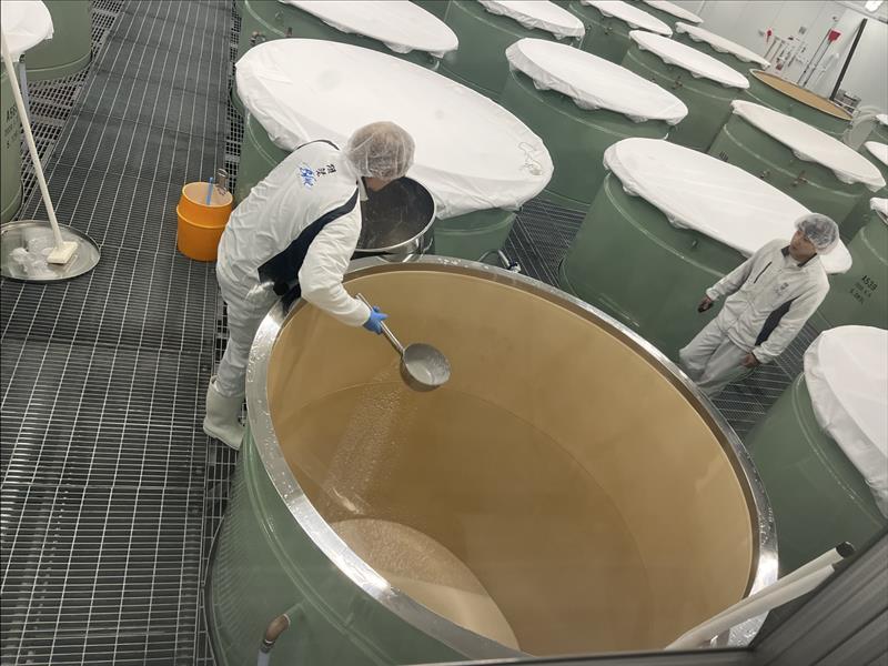 Dassai Blueの酒造りは、多くの工程に人の手が加わる。なかでも、日本酒のもととなる酵母を育てる伝統的な製法「山おろし」は、酒母を一気に投入せず、ゆっくりすくって少しずつ注いでいく。こうしたていねいな手作業によって、雑味のないクリアな味わいが生まれるのだという。