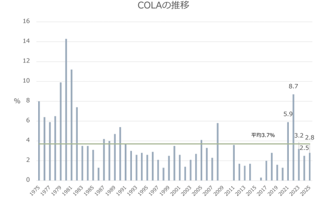 ソーシャル・セキュリティの物価調整率は、COLA(Cost-of-Living Adjustment)と呼ばれています。これは、ソーシャル・セキュリティ受給者の実質購買力を維持するために行われる年一回の増額調整です。
