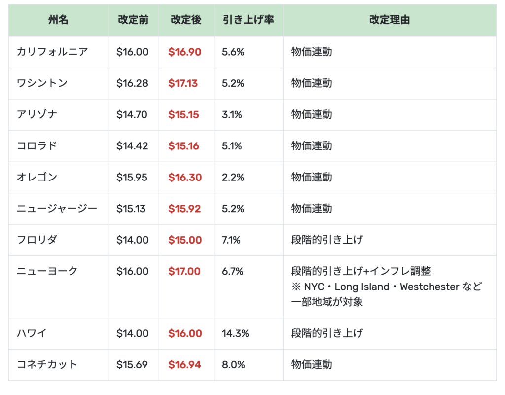 上記に加え、市・郡単位で州を上回る最低賃金が設定されているケースも少なくありません。