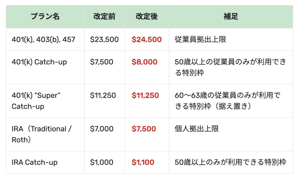 SECURE 2.0 Act (退職貯蓄制度を拡充・強化する連邦法)に基づき、IRS は2026年のリタイアメント拠出限度額を引き上げています。