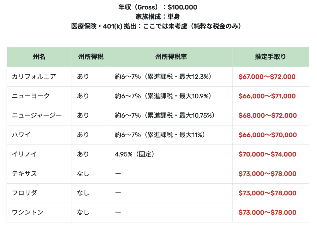 同じ年収でも、州によって年間で$5,000〜10,000以上の差が出るとは驚きですね。
