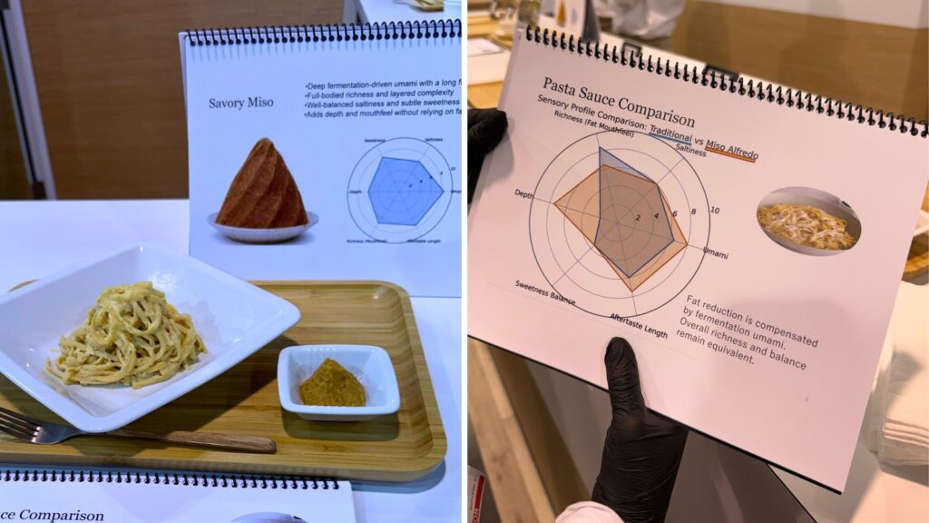 例えば Marukome(マルコメ) のブースでは、味噌を使ったパスタが紹介されていた。クリームパスタにおいて、従来の調味料の一部を味噌で代替することで、料理にコクと深みが生まれ、さらに健康的な食材として訴求されている。