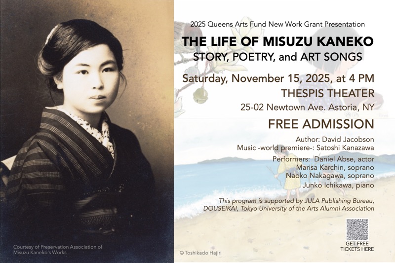 2025年11月15日(土)午後 4 時から、アストリアにある Thespis Theatre にて、ニューヨーク在住の作曲家、金澤恵之のプロデュースで日本の童謡詩人金子みすゞを紹介する朗読と歌曲コンサートが開催される。