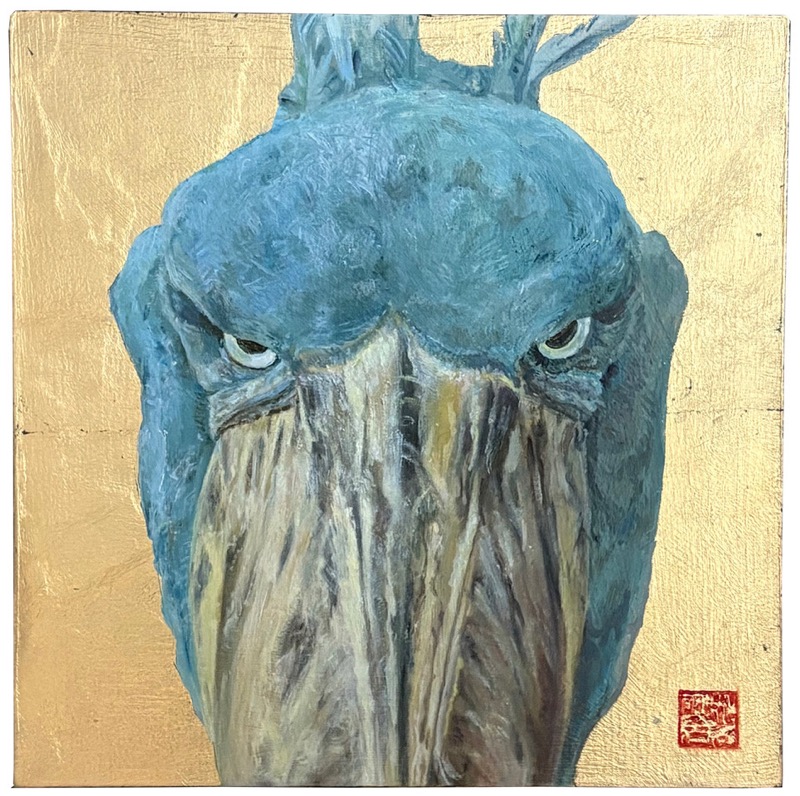 Akiko Matsuo “Shoebill(presence)” 2026 oil paint, composite gold leaf on panel 10″x10”