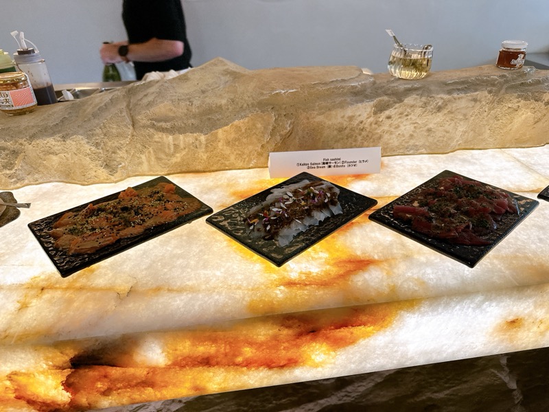 当日はシェフがレストランで提供予定の青森県産の海峡サーモンや鯛やヒラメの刺し身など提供され参加者は新鮮な食材を堪能した。
